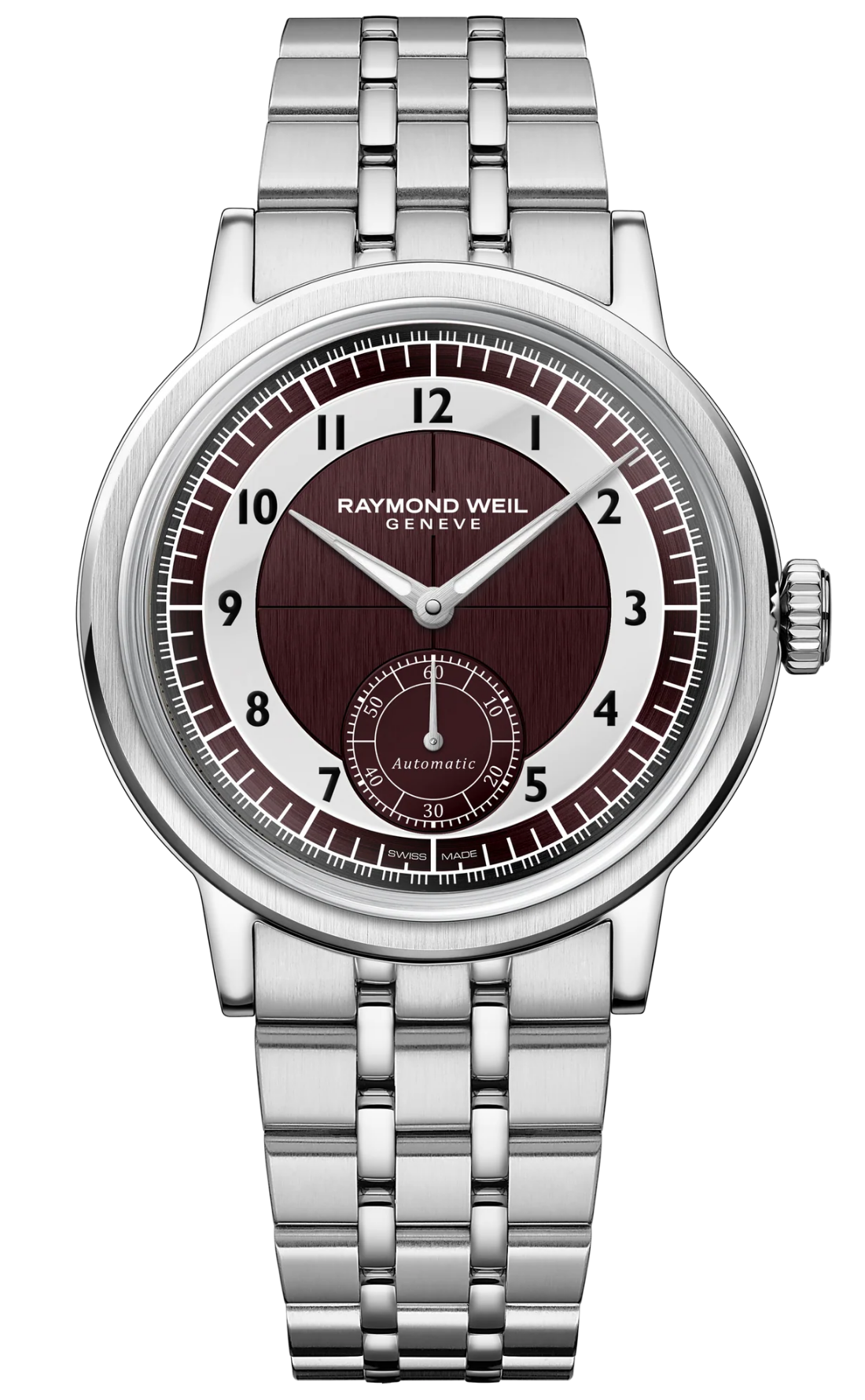 O  RAYMOND WEIL millesime small seconds traz de volta o mostrador Tuxedo, um estilo de design que está a viver um renascimento e que é caracterizado por contrastes de duas cores e uma elegância formal.